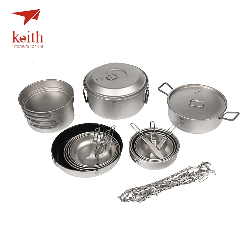 Hot Sale Keith Titanium Cooking Pots Bowls Large Outdoor Camping Set For 4-5 Person 21 Pcs In 1 Lot Picnic C